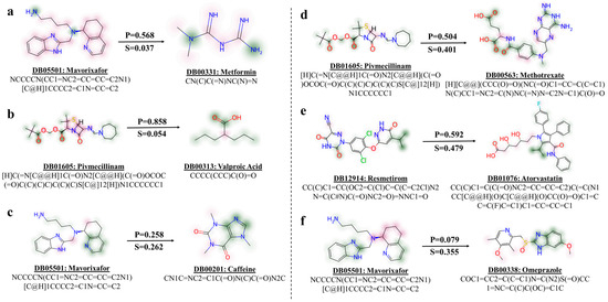 In the context of real-world applications, accurately identifying DDIs is of paramount importance compared to detecting non-interacting drug pairs. From the package inserts of newly approved drugs, we select four DDIs from the newly approved drug package inserts and two non-interacting drug pairs for analysis. As illustrated in Figure 4, subfigures (a), (b), (d), and (e) represent DDIs labeled as ‘1’, and subfigures (c) and (f) represent non-interacting pairs labeled as ‘0’. We annotated each drug with its corresponding drug names, DrugBank ID, and SMILES string to facilitate clear identification.