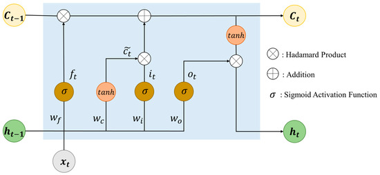 LSTM overcomes the recurrent neural network (RNN) model that forgets starting input information during training [51]. As shown in Figure 7, it can store long-term data information because of the long-range LSTM cell. It contains the input gate, forget gate, and output gate. The input gate determines whether a new token is encoded to overwrite the old token. The forget gate controls whether useless information is discarded. If there is a state of an opened forget gate and closed input gate, the previous data information is stored for as long as possible. The state of the output gate does not affect other gates. It individually determines the open state or closed state by itself. The following equations describe the calculation steps of gates: