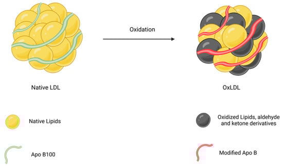 Aldehydes produced during lipid peroxidation can react with apoB, progressively modifying it and altering its receptor interactions. Minimally or mildly oxidized LDL has low levels of lipid peroxidation products and minor apoB alterations, allowing for its uptake through the apoB/E receptor [51]. In contrast, extensively oxidized LDL exhibits significant lipid oxidation and apoB modifications, reducing its affinity for the apoB/E receptor and increasing it for scavenger receptors [35,52].