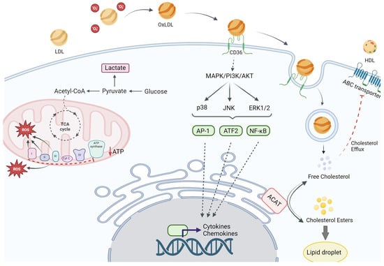 The free cholesterol is then transported out of the lysosome into the cytoplasm, where it can either be used for membrane synthesis or subjected to re-esterification by the enzyme acyl-CoA: cholesterol acyltransferase (ACAT) [69,75]. This enzyme converts free cholesterol into cholesteryl esters for storage within lipid droplets. The accumulation of these cholesteryl esters in lipid droplets contributes to the transformation of macrophages into foam cells. The uptake of OxLDL generates ROS within macrophages, inducing oxidative stress that can damage cellular components, including proteins, lipids, and DNA, and activate redox-sensitive signaling pathways such as NF-κB, promoting the expression of pro-inflammatory genes [76,77]. Foam cells secrete pro-inflammatory cytokines, including TNF-α, IL-1β, and IL-6, which contribute to the inflammatory milieu within atherosclerotic plaques and recruit additional immune cells to the site, perpetuating inflammation and plaque growth [77].
