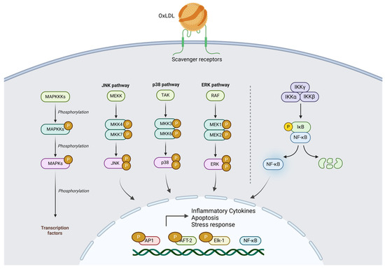 When macrophages are exposed to OxLDL, two key pathways are activated: the NF-kB pathway and the MAPK (mitogen-activated protein kinase) pathway [147]. The NF-kB pathway, central to inflammation and immune responses, is triggered when OxLDL binds to scavenger receptors such as CD36 and LOX-1 on macrophages, leading to the activation of IKK (IκB kinase), which phosphorylates and degrades IκB, an inhibitor of NF-kB [148]. This degradation frees NF-kB to enter the nucleus and promote the transcription of pro-inflammatory genes, which results in the production of cytokines, chemokines, and other molecules that drive inflammation. At the same time, OxLDL also triggers the MAPK ERK1/2 pathway through signaling cascades involving receptor tyrosine kinases or G-protein-coupled receptors (GPCRs) [149]. Activation of ERK1/2 can occur via upstream activators often initiated by OxLDL-induced oxidative stress or receptor-mediated mechanisms. Interestingly, ERK1/2 activation is not only regulated by these external triggers but can also be enhanced by the NF-kB pathway itself. NF-kB can indirectly contribute to ERK1/2 activation by upregulating the expression of pro-inflammatory cytokines like TNF-α, which in turn can stimulate the activation of ERK1/2 through autocrine or paracrine signaling mechanisms. This creates a feedback loop where NF-kB activation promotes ERK1/2 activation and ERK1/2 enhances NF-kB’s transcriptional activity, amplifying the inflammatory response in macrophages [150,151,152]. In addition to ERK1/2, OxLDL activates other branches of the MAPK pathway, including JNK1/2 (c-Jun N-terminal kinases) and p38, which primarily respond to oxidative stress. JNK1/2 and p38 are stress kinases that help regulate the cellular response to oxidative damage and apoptosis [149]. While ERK1/2 strengthens the inflammatory response by interacting with NF-kB, JNK1/2 and p38 are more involved in cellular stress responses and apoptosis rather than directly promoting inflammation. Together, the activation of these pathways by OxLDL in macrophages highlights the dual role of OxLDL in promoting both inflammation and cellular stress, which are key factors in the development of atherosclerosis.