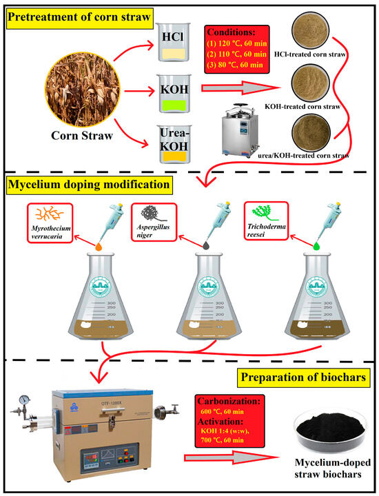 Modification is a viable approach for significantly further enhancing the efficacy of biochar [12,13,14]. The common methods of straw biochar modification include the addition of charcoal, functional modification, and doping modification. Acids and bases are commonly used to remove minerals and silicon impurities from biochar. To make biochar functional, it is common to use sources that are oxygen-rich (such as hydrogen peroxide) or rich in amino drugs (polyamines). Generally, doping modification does not require specific reagents, and the wide range of sources of doping materials is almost unlimited, which attracts more scholars. Mycelium, 3D network structures formed by fungal spores via meristem, are rich in monomer compounds (e.g., anthraquinone, sterols, and aromatic hydrocarbons) and functional groups [15,16,17]. Given the problem of cost and simple operations, it seems to be a better choice to dope biochar with microbial fungal mycelium compared with most inorganic doping and organic synthesis processes. But little studies have been reported, which encourages us to explore this interesting area.