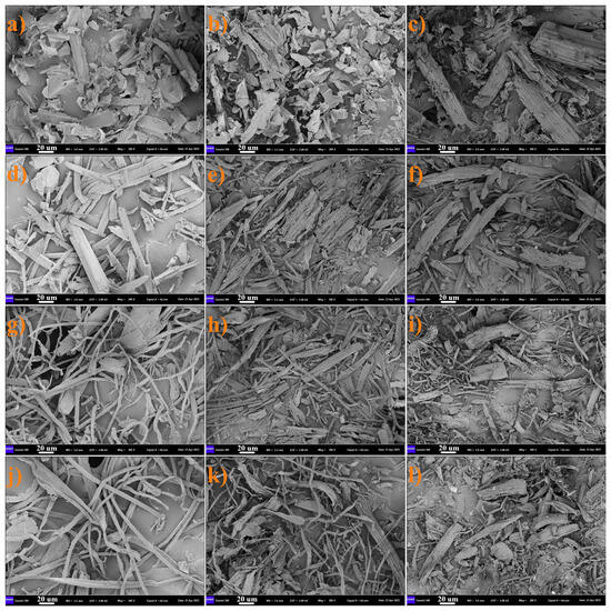 The scanning electron microscopy (SEM) imagines of (a) corn straw, (b) carbonized corn straw, (c) corn straw biochar, (d) urea/KOH-T. reesei-treated corn straw, (e) carbonized urea/KOH-T. reesei-treated corn straw, (f) urea/KOH-T. reesei-treated corn straw biochar, (g) KOH-M. verrucaria-treated corn straw, (h) carbonized KOH-M. verrucaria-treated corn straw, (i) KOH-M. verrucaria-treated corn straw biochar, (j) HCl-A. niger-treated corn straw, (k) carbonized HCl-A. niger-treated corn straw, and (l) HCl-A. niger-treated corn straw biochar.