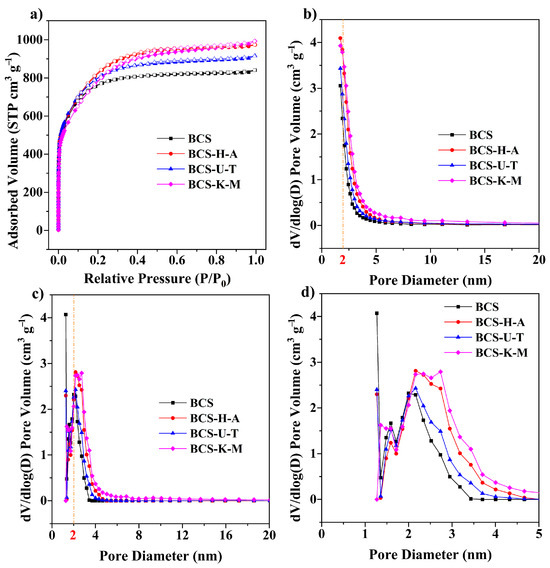 N2 adsorption–desorption isotherm tests were performed on the samples to evaluate the pore structure characteristics of the biochar (Figure 3 and Table S2). The Brunauer–Emmett–Teller (BET) theory was used to calculate the surface area. The non-local density functional theory (NLDFT) and the Barrett–Joyner–Halenda (BJH) model were used to analyze the pore size distribution of samples. All the samples showed I and IV isotherm models, indicating that the prepared biochars were porous carbons with microporous and mesoporous structures [19,20], which is consistent with the results of Figure 3b–d. The BET specific surface area (SBET) of BCS is 2429 m2 g−1 and the total pore volume is 1.30 cm3 g−1. At the same time, the SBETs of BCS-U-T, BCS-K-M, and BCS-H-A are 2604, 2790, and 2715 m2 g−1, respectively, and the corresponding total pore volumes (Vtotal) are 1.42, 1.51, and 1.54 cm3 g−1. The SBET of BCS is lower than that of mycelium-modified straw biochar (BCS-U-T, BCS-K-M, and BCS-H-A), which may be due to two reasons. On the one hand, the decomposition of pretreated straw by microorganisms in the process of solid fermentation makes the straw structure broken and fluffy, and part of the macroporous structure is generated, which greatly increases the contact area between the activator and carbonizing precursor and promotes the activation efficiency of the activator; this, in turn, creates a more porous structure. In addition, mycelium, as a micron-scale filamentous substance, also becomes thinner during carbonization and activation, resulting in fracture, etching, and a porous structure (Figure 2d–1), which on the other hand improves the activation efficiency and further increases the specific surface area of the biochar. Mycelium doping modified straw can increase the SBET of straw-based biochars by 7–15% and the Vtotal by 9–18%, showing that the mycelium doping modification is an effective way to further improve the physicochemical properties (especially the pore structure) of straw biochar.