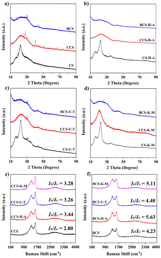 X-ray diffraction (XRD) tests of (a) CS, CCS, and BCS; (b) CS-H-A, CCS-H-A, and BCS-H-A; (c) CS-U-T, CCS-U-T, and BCS-U-T; (d) CS-K-M, CCS-K-M, and BCS-K-M. Raman spectra of (e) CCS, CCS-H-A, CCS-U-T, and CCS-K-M; (f) BCS, BCS-H-A, BCS-U-T, and BCS-K-M.