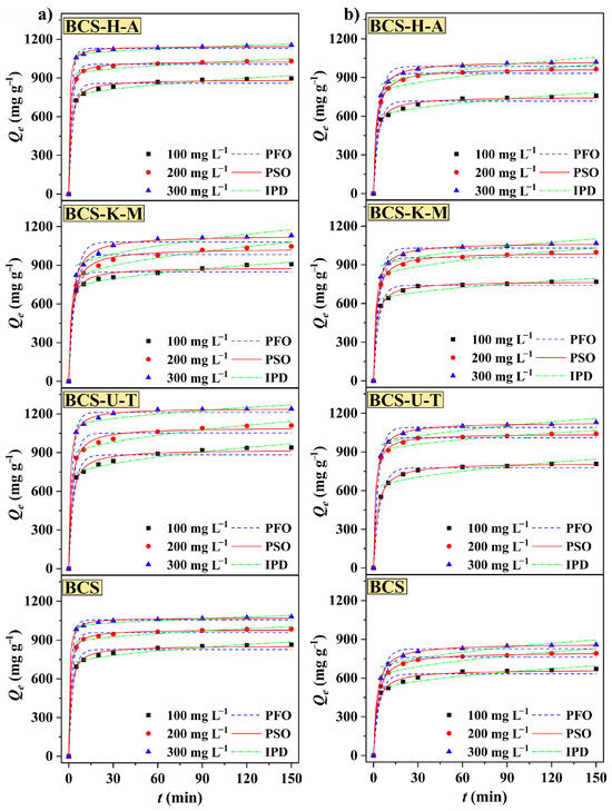 The adsorption plots of BCS, BCS-H-A, BCS-U-T, and BCS-K-M fitted with adsorption kinetic models for (a) TH and (b) CP at 303 K (dose of biochars: 10 mg; V: 200 mL; temperature: 303 K; pH: 7.0; shaker speed: 150 RPM).