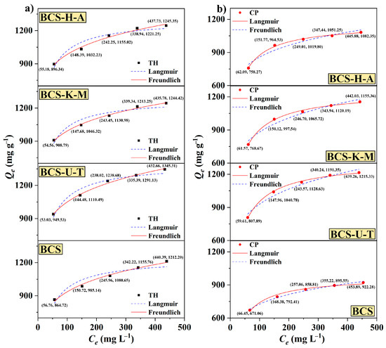 The adsorption isotherms of BCS, BCS-U-T, BCS-K-M, and BCS-H-A to (a) TH and (b) CP at 303 K (dose of biochars: 10 mg; V: 100 mL; temperature: 303 K; pH: 7.0; shaker speed: 150 RPM).