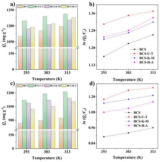 Effects of different temperatures on the adsorption capacities of biochars and the plot of ln(Qe/Ce) versus T for adsorption of TH (a,b) and CP (c,d) (dose of biochars: 10 mg; V: 100 mL; C0: 400 mg/L; pH: 7.0; shaker speed: 150 RPM).