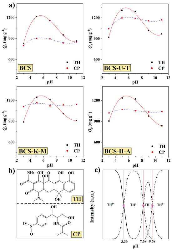 One of the main aspects impacting the adsorption process is the pH value of the solution environment, which frequently impacts the adsorption process by modifying the surface characteristics of the adsorbent and the chemical properties of the adsorbate [40]. We investigated the influence of the initial pH of the solution on antibiotic adsorption by biochars (Figure 8), and it can be noted that with rising initial pH of the solution, TH adsorption displayed a pattern of increasing and then decreasing. Meanwhile, the impact of this technique on CP was minimal. The clear effect of pH on the adsorption of TH by biochars may be because it not only changes the surface electrochemical characteristics of biochars but also has a large influence on the molecular properties of TH. In general, distinct types of TH occur at different pH levels. When the pH is less than 3.30, TH1+ dominates and biochars have a positive zeta potential (pHpzc = 4.97 for BCS, pHpzc = 3.34 for BCS-U-T, pHpzc = 4.32 for BCS-K-M, and pHpzc = 4.73 for BCS-H-A). At this point, mutually repellent electrostatic attraction prevents adsorption. TH occurs as TH0 when the pH is between 3.30 and 7.68. When the pH value is between 7.68 and 9.68, TH occurs in the form of TH1−. When the pH exceeds 9.68, however, TH is dominated by TH2− [41]. The pKa of CP is 5.50 [42], and when the solution pH is close to this value, CP exists in a neutral form (i.e., non-ionized fraction), which explains why the maximum adsorption capacity of biochar for CP occurs at pH values of 4–6.