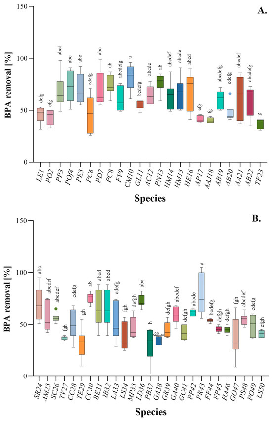 Results of the BPA removal by homogenates of cultivated (A) and wild (B) fungi. One-way ANOVA with Tukey’s post-hoc test, p < 0.05. Bars with different letters (a–h) are statistically significantly different from each other (n = 9); dots indicate the most divergent results.