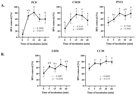The Person’s correlation test showed a high correlation between the time of incubation and the percentage of BPA removal for the CC30 and LD36 fungi, and a very high correlation for the PN13 species, although no correlations were statistically significant. As a result of this experiment, 15 min of incubation for fungi in Group A and 30 min for fungi in Group B were selected as the optimum.