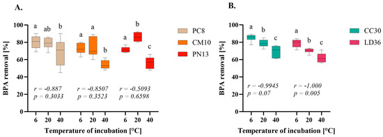 Evaluating the impact of temperature on wastewater treatment is an important aspect of new sorbent research that is often overlooked. Consequently, an investigation was conducted to assess the feasibility of BPA removal at various temperatures, commencing with 20 °C, which is considered representative of the temperature of wastewater that is typically found within the range of 10–20 °C during most of the year [33]. In addition, two extreme temperatures of 6 and 40 °C were also tested to account for potential fluctuations beyond the typical range [34]. The time of incubation was selected for each species based on the results from the previous experiment. As depicted in Figure 3, the lowest BPA removal efficiency was observed at 40 °C for all tested fungi. However, the results for fungi in Group A were not clearly differentiated between 6 and 20 °C. The results for species PN13 were significantly higher at 20 °C compared to the other temperatures. In contrast, the results for Group B showed higher efficiency at 6 °C, which decreased with increasing temperature. The correlation between temperature and BPA removal efficiency was high for fungi CC30 and LD36 and statistically significant for the LD36 strain in the Pearson’s correlation test. One of the potential explanations for such correlation may be the influence of temperature on the solubility of the substance and consequently on the adsorption rate. The underlying principle posits that lower temperature reduces a substance’s solubility and promotes higher adsorption. This could theoretically result in a 100% BPA elimination rate at 6 °C. Indeed, the elimination rate is marginally higher at 6 °C compared to results obtained at 20 °C for CC30 and LD36 species, but it did not reach 100%. This observation suggests substantial BPA solubility even at lower temperatures. Furthermore, comparison of the absorbance of control BPA solutions incubated at tested temperatures and centrifuged revealed no discernible difference, confirming that BPA did not precipitate. Interestingly, more efficient BPA and its analogues removal at lower temperatures was also observed in treatment plants [11]. Additionally, it is plausible that the high dose of BPA interfered with observations. A concentration of 100 mg/L BPA may have saturated all binding sites, preventing 100% binding of the substance. Application of a lower dose of BPA would potentially allow binding of all its molecules and yield more definitive results.