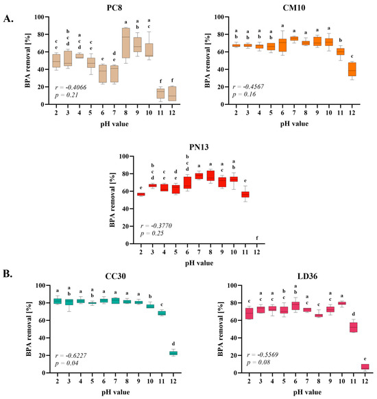 Results of incubation buffer pH value on the rate of the BPA removal by homogenates of cultivated fungi (A) and wild fungi (B). One-way ANOVA with Tukey’s post-hoc test, p < 0.05. Bars with different letters (a–f) are statistically significantly different from each other (n = 9). The correlations were analyzed using Pearson’s correlation coefficient r and the statistical significance p of this coefficient.