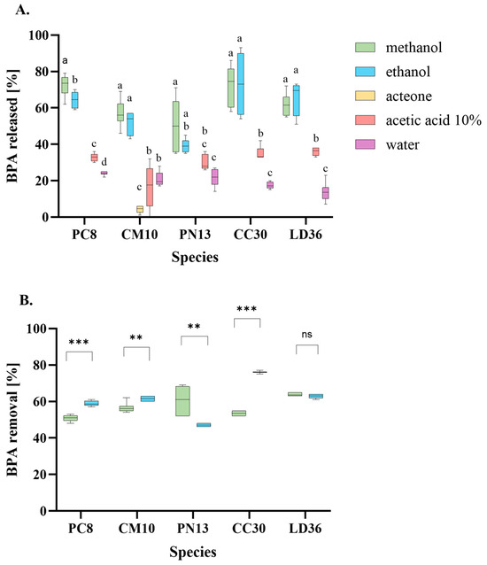 Since methanol and ethanol showed equally efficient desorption, a second batch of BPA removal was performed on both regenerated samples. As depicted in Figure 6B, three out of five fungi, namely PC8, CM10, and CC30, exhibited significantly better results with ethanol-regenerated biomass. Conversely, PN13 and LD36 exhibited higher BPA adsorption following methanol regeneration. In the case of LD36, the difference was negligible and statistically insignificant in the unpaired t-test. It is worth noting that the ethanol-regenerated biomass displayed varying sorption capacity retention. The most efficient CC30 fungus, for instance, demonstrated 76% BPA sorption, which corresponded to 94% of its initial efficiency compared to the first batch. The results for the remaining three fungi, LD36, CM10, and PC8, were similarly consistent, with values of 63, 61, and 59%, respectively, representing 83, 76, and 81% of their initial efficiency. In contrast, only one methanol-regenerated PN13 fungus displayed 60% BPA removal, corresponding to 80% of its initial efficiency. These results are similar to those obtained in BPA removal studies by walnut shell-based activated carbon [53]. Consequently, based on our findings and available literature, it is evident that there is no universal regeneration solvent. Lee and colleagues showed that regeneration of porphyrinic porous organic polymer with acetone was possible and the remaining adsorption capacity was high, whereas in our sorbents, acetone was entirely ineffective desorption solvent [43]. In contrast, the findings from our desorption investigations (Figure 6A) indicated that the most effective solvent was methanol. However, Yonten and colleagues reported no BPA desorption from immobilized P. eryngii mycelia using methanol. Instead, they found that acetonitrile was the most effective solvent, although the BPA recovery was still 1.5–2.5 times lower than our results obtained with methanol [25]. Ethanol was a second noteworthy solvent for the desorption of BPA in our study, and its efficacy has been previously reported in the scientific literature. Its effectiveness at various concentrations has been documented in studies involving reduced or functionalized graphene oxide or nanocomposites, and the results are consistent with our findings [48,49,54]. Therefore, ethanol may be considered a beneficial regeneration solvent due to its efficiency and less toxicity. Moreover, since different mechanisms are involved in BPA sorption, a mix of solvents is worth considering for even better desorption and prolonging sorbent reusability.