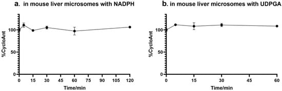 Stability of CycloAnt in mouse liver microsomes. The percentage of CycloAnt remaining after incubation with liver microsomes at 37 °C (a) in the presence of NADPH; (b) in the presence of UDPGA.