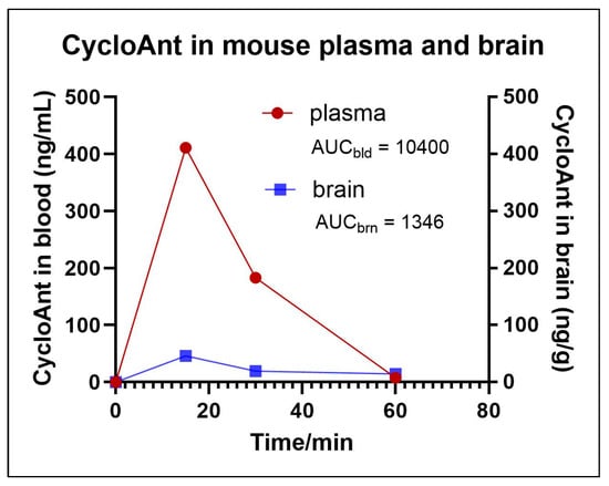 The LC-MS/MS detection shows that CycloAnt is present in blood and brain; at 15 min post-injection it reaches the maximum concentrations in blood as well as in the brain. The maximum concentration of CycloAnt in mouse plasma (Cmax,pl) was calculated to be 411 ng/mL and the maximum concentration of CycloAnt in brain (Cmax,br) was 46 ng/g, or 70 nM, assuming that the density of brain tissue is 1 g/mL (Figure 4). This study confirmed that CycloAnt penetrated the BBB after systemic administration. The brain-to-plasma ratio of CycloAnt is 11.5%, determined by the ratio of the areas under the curves (AUC), which is a high extent of BBB transport in terms of a peptide [].