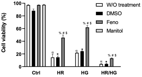 Effect of fenofibrate (10 μM) on cell viability. Cell viability was measured by trypan blue dye caption in cells from every experimental group: control (Ctrl), hypoxia/reoxygenation (HR), high glucose (HG), and a combination of both conditions (HR/HG). For the control group, an osmolarity control group was included with mannitol. Two-way ANOVA followed by Tukey’s post hoc test. n = 6 α p < 0.05 vs. Ctrl-W/O, * p < 0.05 vs. Ctrl-DMSO group, % p < 0.05 vs. Ctrl-Feno group, # p < 0.05 vs. W/O group, and $ p < 0.05 vs. DMSO group.