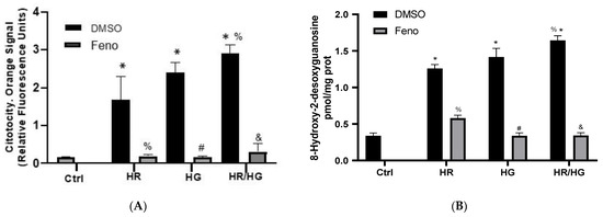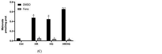 The hallmark process of cytotoxicity is the secretion of granules. They contain pore-forming proteins and apoptosis-related proteins. Our results show that cells subjected to HR, HG, or HR/HG treatments developed greater cytotoxicity, evidenced as a higher apoptosis rate and cell damage. Cells treated with feno exhibited lower cytotoxicity compared to cells exposed to an altered environment and vehicle treated (Figure 3A). To explore apoptosis-induced nuclear damage, we evaluated 8-hydroxy-2-deoxyguanosine (8-OH-2dG) (Figure 3B). Our results show that HR, HG, and HR/HG induced a raise in its expression, while the groups treated with feno exhibited a lower 8-OH-2dG value (Figure 3B). Malonate is a competitive inhibitor of succinic dehydrogenase, arresting the Krebs cycle. Succinic dehydrogenase catalyzes the reaction converting dehydrogenated succinate to fumarate. Malonate may induce apoptosis in mitochondria, since it damages mitochondrial cell respiration, inhibiting complex II, and preventing the oxidative phosphorylation reaction. Our results show that HR, HG, and HR/HG-subjected cell cultures exhibited an increased malonate production, while the groups treated with feno significantly decreased its production (Figure 3C). These results support the hypothesis that feno protects mitochondria and mitochondrial respiration.