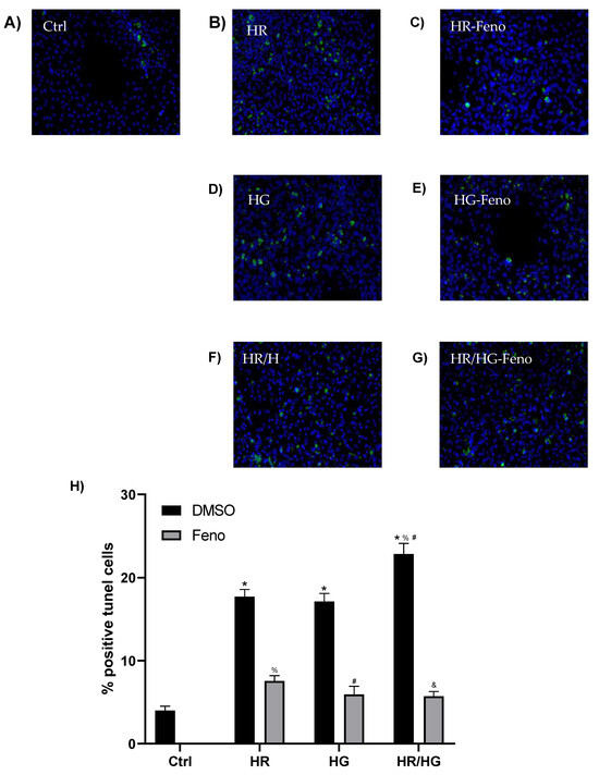 TUNEL test representative images of (A) Ctrl, (B) HR, (C) HR-F, (D) HG, (E) HG-F, (F) HR/HG, and (G) HR/HG-F. The green mark corresponding to cell nuclei in apoptosis and the blue mark for the other nuclei are observed. (H) Quantification of tunel images. One-way ANOVA followed by Tukey’s post hoc test, n = 6. * p < 0.05 vs. Ctrl-DMSO, % p < 0.05 vs. HR-DMSO group, # p < 0.05 vs. HG-DMSO group, and & p < 0.05 vs. HR/HG-DMSO group. Feno: fenofibrate treatment, Ctrl: control group, HR: hypoxia/reoxygenation group, HG: high glucose group, and HR/HG: hypoxia/reoxygenation and high glucose group.