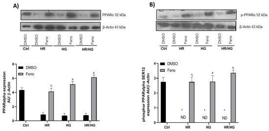 Expression and densitometric analysis of (A) PPARα and (B) PPARαSER12 proteins. One-way ANOVA followed by Tukey’s post hoc test, n = 6. * p < 0.05 vs. DMSO Ctrl, % p < 0.05 vs. DMSO HR group, # p < 0.05 vs. DMSO HG group, and & p < 0.05 vs. DMSO HR/HG group. Feno: fenofibrate treatment, Ctrl: control group, HR: hypoxia/reoxygenation group, HG: high glucose group, HR/HG: hypoxia/reoxygenation and high glucose group, and ND: not detected.