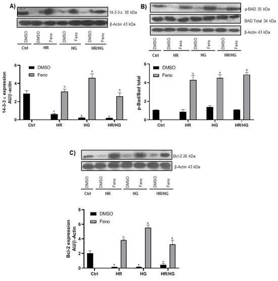 Expression and densitometric analysis of (A) 14-3-3-ε, (B) p-Bad, and (C) Bcl-2 proteins. One-way ANOVA followed by Tukey’s post hoc test, n = 6. * p < 0.05 vs. Ctrl-DMSO, % p < 0.05 vs. HR-DMSO group, # p < 0.05 vs. HG-DMSO group, and & p < 0.05 vs. HR/HG-DMSO group. Feno: fenofibrate treatment, Ctrl: control group, HR: hypoxia/reoxygenation group, HG: high glucose group, and HR/HG: hypoxia/reoxygenation and high glucose group.