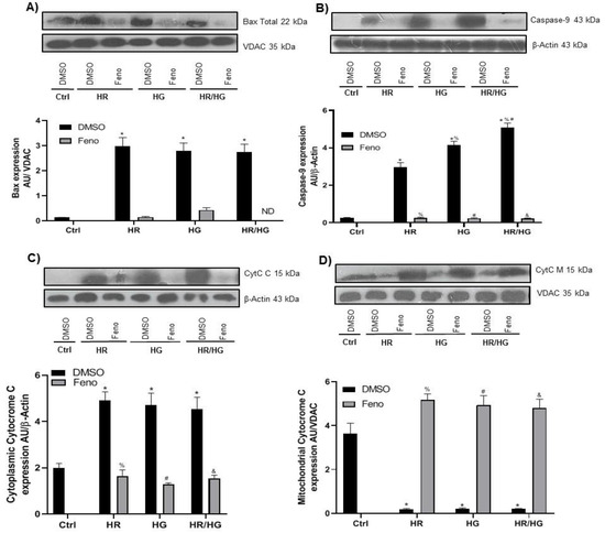 Protein expression and densitometric analysis of (A) Bax, (B) caspase-9, (C) cytoplasmic cytochrome c, and (D) mitochondrial cytochrome c proteins. One-way ANOVA followed by Tukey’s post hoc test, n = 6. * p < 0.05 vs. Ctrl-DMSO, % p < 0.05 vs. DMSO HR group, # p < 0.05 vs. DMSO HG group, and & p < 0.05 vs. DMSO HR/HG group. Feno: fenofibrate treatment, Ctrl: control group, HR: hypoxia/reoxygenation group, HG: high glucose group, and HR/HG: hypoxia/reoxygenation and high glucose group, and ND: not detected.