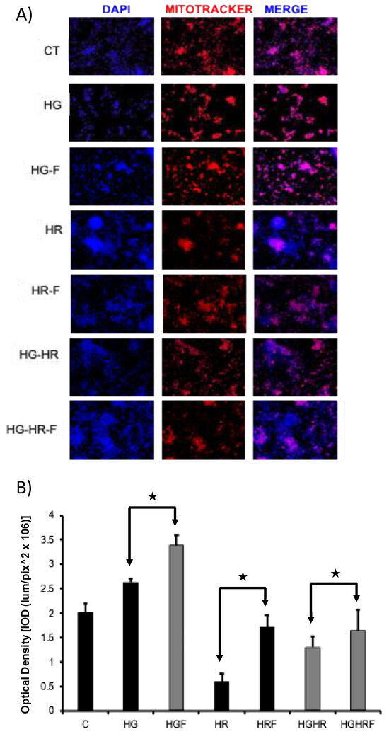 MitoTracker Deep Red staining in primary culture of neonatal cardiomyocyte cells. (A) Fluorescence microscopy images show the distribution of the Deep Red MitoTracker mitochondria-specific marker. (B) Eight 20× images (4/well) of each condition were quantified; IOD = (lum/pix^2 × 106)]. The nuclei were labeled in blue, with 4′,6-diamidino-2-phenylindole (DAPI). Merge was carried out with a gray background to highlight the red MitoTraker mark. Feno: fenofibrate treatment, Ctrl: control group, HG: high glucose group, HR: hypoxia/reoxygenation group, and HR/HG: hypoxia/reoxygenation and high glucose group. ★ p < 0.05.