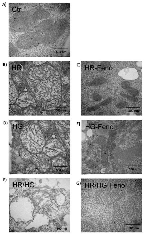 Ultrastructure of cardiomyocytes in primary cultures to observe mitochondria. (A) control, (B) HR, (C) HR-Feno, (D) HG, (E) HG-Feno, (F) HR/HG, and (G) HR/HG-Feno. Details of the ultrastructure by electron microscopy: 500 nm, 50,000×. Feno: fenofibrate treatment, Ctrl: control group, HR: reoxygenation group, HG: high glucose group, and HR/HG: reoxygenation and high glucose group. The images are representative of six experiments per group.
