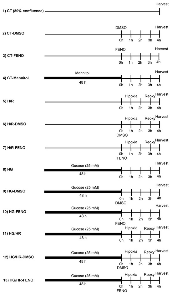 The experimental groups are represented in this figure. Mannitol (19.5 mM) and high glucose (25 mM) were administered 48 h before fenofibrate (10 μM) or DMSO (0.1%). The treatment with fenofibrate or DMSO lasted for 4 h; CT = control, HR = hypoxia/reoxygenation, DMSO = dimethylsulfoxide (0.1%), HG = high glucose, and FENO = fenofibrate (10 μM).