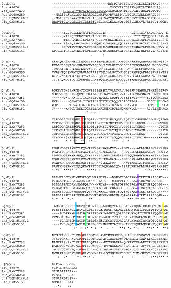 The ProtParam tool (http://web.expasy.org/protparam/, accessed on 16 May 2024) was used to predict the theoretical pI, molecular mass, and molar extinction coefficient of DyP. Sequences were aligned with Clustal 2.1, ready for comparison (https://www.genome.jp/tools-bin/clustalw, accessed on 16 May 2024). SignalP-5.0 prediction was used to detect the presence of a signal peptide for protein secretion (https://services.healthtech.dtu.dk/services/SignalP-5.0/, accessed on 15 May 2024).