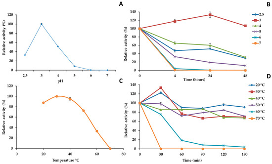 Effects of pH and temperature on CgaDyP1 activity and stability: (A) optimal pH for the oxidation of ABTS (5 mM); (B) pH stability in the range pH 2.5–7 for 4, 24, and 48 h incubation; (C) optimal temperature for the oxidation of ABTS; (D) temperature stability in the range 20–70 °C. Enzyme activity was measured in a 0.1 M citrate-phosphate buffer using ABTS (5 mM) as a reducing substrate and 0.25 mM H2O2 at 30 °C (and at pH 3.0 in (C,D)). Activity values were calculated as a percentage of maximum activity (set to 100%) at optimum temperature and pH. Each data point (mean ± standard deviation) is the result of triplicate experiments.