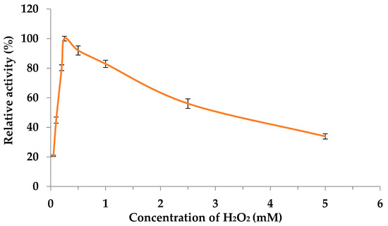 Effect of hydrogen peroxide on CgaDyP1 activity. Assays targeted the optimal concentration of hydrogen peroxide in standard conditions, using ABTS (5 mM) as substrate. Each data point (mean ± standard deviation) is the result of triplicate experiments.