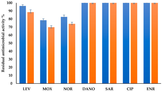 Biotransformation of fluoroquinolones by CgaDyP1 after 24 h of incubation at 30 °C. ■ Residual antimicrobial activity after 8 h of incubation at 30 °C and at pH = 3 for 24 h; ■ Residual antimicrobial activity after 24 h of incubation at 30 °C and at pH = 3 for 24 h. LEV: levofloxacin, MOX: moxifloxacin, NOR: norfloxacin, ENR: enrofloxacin, DAN: danofloxacin, CIP: ciprofloxacin, SAR: sarafloxacin.