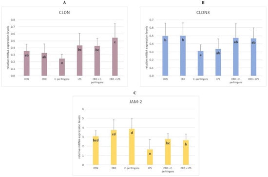 The relative mRNA expression levels (normalized to the glyceraldehyde-3-phosphate dehydrogenase expression and β-actin levels as the most accurate endogenous control gene) of (A) claudin (CLDN), (B) claudin 3 (CLDN-3), and (C) junctional adhesion molecule 2 (JAM-2) in the jejunum tissue of chickens. The chickens were fed a control diet (CON), CON supplemented with 30 g of hemp extract/kg diet (CBD), CON diet and subjected to E. coli LPS and C. perfringens challenge (LPS and C. perfringens), and CON diet supplemented with 30 g of hemp extract/kg diet and subjected to E. coli LPS and C. perfringens (CBD + LPS and CBD + C. perfringens). Significant differences are indicated by different letters (p < 0.05). The error bars indicate the pooled standard deviations in each dietary treatment group for the eight chickens.