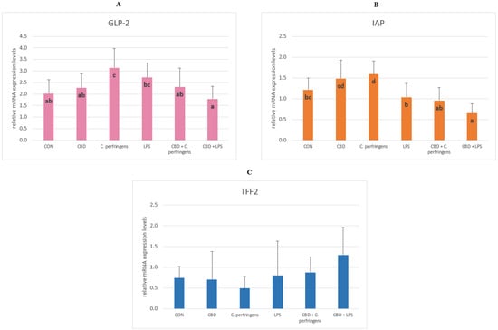 The relative mRNA expression levels (normalized to the glyceraldehyde-3-phosphate dehydrogenase and β-actin expression levels as the most accurate endogenous control gene) of (A) glucagon like peptide 2 (GLP-2), (B) intestinal alkaline phosphatase (IAP), and (C) trefoil factor 2 (TFF2) in the jejunum tissue of chickens. The chickens were fed a control diet (CON), CON supplemented with 30 g of hemp extract/kg diet (CBD), CON diet and subjected to E. coli LPS and C. perfringens challenge (LPS and C. perfringens), and CON diet supplemented with 30 g of hemp extract/kg diet and subjected to E. coli LPS and C. perfringens (CBD + LPS and CBD + C. perfringens). Significant differences are indicated by different letters (p < 0.05). The error bars indicate the pooled standard deviations in each dietary treatment group for the eight chickens.