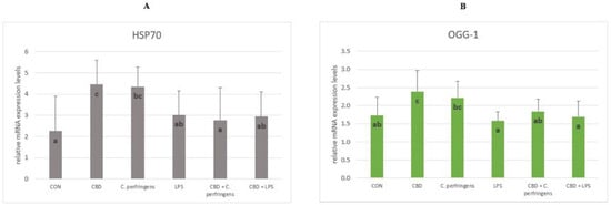 The relative mRNA expression levels (normalized to the glyceraldehyde-3-phosphate dehydrogenase and β-actin expression levels as the most accurate endogenous control gene) of (A) heat shock protein 70 (HSP70) and (B) 8-oxyguanine DNA glycosylase (OGG-1) in the jejunum tissue of chickens. The chickens were fed a control diet (CON), CON supplemented with 30 g of hemp extract/kg diet (CBD), CON diet and subjected to E. coli LPS and C. perfringens challenge (LPS and C. perfringens), and CON diet supplemented with 30 g of hemp extract/kg diet and subjected to E. coli LPS and C. perfringens (CBD + LPS and CBD + C. perfringens). Significant differences are indicated by different letters (p < 0.05). The error bars indicate the pooled standard deviations in each dietary treatment group for the eight chickens.