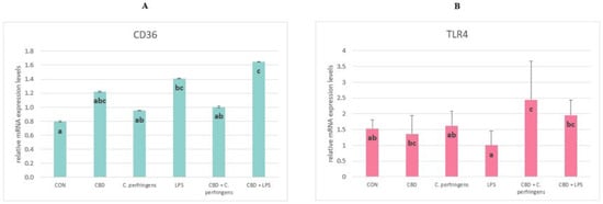 The relative mRNA expression levels (normalized to the glyceraldehyde-3-phosphate dehydrogenase and β-actin expression levels as the most accurate endogenous control gene) of (A) CD36 molecule (CD36) and (B) toll-like receptor 4 (TLR4) in the jejunum tissue of chickens. The chickens were fed a control diet (CON), CON supplemented with 30 g of hemp extract/kg diet (CBD), CON diet and subjected to E. coli LPS and C. perfringens challenge (LPS and C. perfringens), and CON diet supplemented with 30 g of hemp extract/kg diet and subjected to E. coli LPS and C. perfringens (CBD + LPS and CBD + C. perfringens). Significant differences are indicated by different letters (p < 0.05). The error bars indicate the pooled standard deviations in each dietary treatment group for the eight chickens.