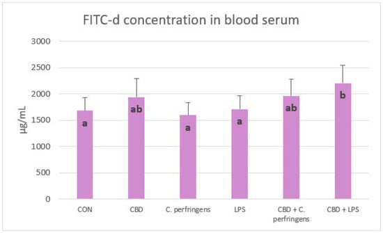 Serum FITC-d concentrations were significantly lower in control and infected groups than in birds infected with E. coli LPS fed a diet with CBD (p = 0.001). In contrast, FITC-d levels were not significantly different between the control and infected groups without CBD supplementation and between CBD, CBD + C. perfringens and CBD + LPS groups (Figure 6).