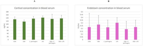 (A) Cortisol (ng/mL) and (B) endotoxin (LPS, EU/mL (endotoxin units)) concentrations in the blood serum of the chickens. The chickens were fed a control diet (CON), CON supplemented with 30 g of hemp extract/kg diet (CBD), CON diet and subjected to E. coli LPS and C. perfringens challenge (LPS and C. perfringens), CON diet supplemented with 30 g of hemp extract/kg diet and subjected to E. coli LPS and C. perfringens (CBD + LPS and CBD + C. perfringens). The error bars indicate the pooled standard deviations in each dietary treatment group for the eight chickens. The SEM for cortisol is 2.77, and for endotoxin, it is 0.023.