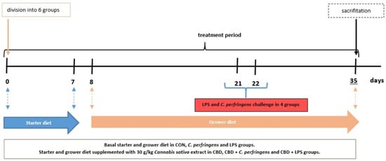 On the day of hatching, a total of 204 Ross 308 male broilers were purchased from a local hatchery. Upon arrival at the experimental unit, the birds were divided into six treatment groups according to average body weight, each containing 34 chicks. Chickens received a starter diet on days 0–7, and a grower diet from day 8 until the end of the experiment. The birds consumed diets similar to a commercial one formulated to meet or exceed the Ross 308 broilers nutritional requirements according to their age. Throughout the experiment, access to drinking water and feed was unrestricted. The birds in each group were kept on bedding in pens, and housing conditions, such as light cycle (an 18-h day cycle and a 6-h night cycle), humidity, and temperature, were maintained according to standard management practices for commercial poultry houses. Throughout the experiment, broilers in the control (CON) group were fed a basal diet, while those in the CBD group consumed a control diet supplemented with 30 g/kg of C. sativa extract. Chickens in the LPS and C. perfringens (positive control) groups were challenged with E. coli LPS and C. perfringens, respectively, and received the CON diet. Birds in the CBD + E. coli LPS and CBD + C. perfringens groups consumed the same diet as the CBD group and were challenged in addition. The division into groups is shown in Table 5. Using a CL-2 CPM (CPM, Colcord, OK, USA) laboratory pellet mill, the diets were cold pelleted. A simple diagram of the study is shown in Figure 8.