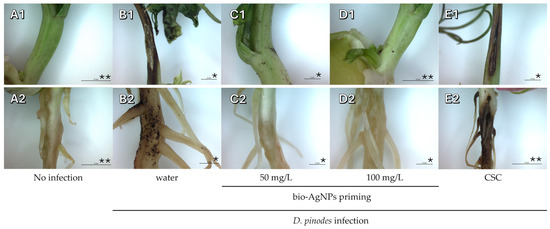 The base of shoot and primary root (A1–E1 and A2–E2, respectively) of 21-day-old uninfected seedlings of pea (developed from seeds primed with water, A1 and A2) and seedlings infected with D. pinodes (B–E). The infected seedlings developed from seeds primed with water (B1,B2), bio-AgNPs at concentrations of 50 mg/L (C1,C2) or 100 mg/L (D1,D2), and a commercial seed coating (CSC) mixture (Maxim 025 FS with 2.38% fludioxonil 25 g/L, E1,E2). Scale bars: * = 2 mm and ** = 5 mm.