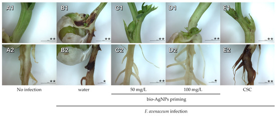 The base of shoot and primary root (A1–E1 and A2–E2, respectively) of 21-day-old uninfected seedlings of pea (developed from seeds primed with water, A1,A2) and seedlings infected with F. avenaceum (B–E). The infected seedlings developed from seeds primed with water (B1,B2), bio-AgNPs at concentrations of 50 mg/L (C1,C2) or 100 mg/L (D1,D2), and a commercial seed coating (CSC) mixture (Maxim 025 FS with 2.38% fludioxonil 25 g/L, E1,E2). Scale bars: * = 2 mm and ** = 5 mm.
