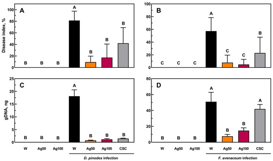 The disease index (the percentage of disease symptoms) of pea seedlings grown from seeds primed with water (W, black), bio-AgNPs at concentrations of 50 mg/L (Ag50, orange) and 100 mg/L (Ag100, burgundy), and a commercial seed coat (CSC, grey), caused by D. pinodes (A) and F. avenaceum (B), and the quantity of D. pinodes (C) and F. avenaceum (D) measured by qPCR in the pea seedlings 14 days post-inoculation. Values are the means of 3 replicates + SD. The same letters above the bars indicate statistically insignificant (p ≤ 0.01) differences based on two-way ANOVA and Tukey’s post-hoc test.