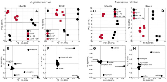 PCA score (A–D) and loading plots (E–H) of the metabolic profiles of the shoots and roots of 21-day-old seedlings of pea (Pisum sativum L.) developed from seeds after water and bio-AgNPs priming, 14 days after D. pinodes (A,B,E,F) or F. avenaceum (C,D,G,H) inoculation. Abbreviations: W and W + DP/FA—uninfected seedlings and seedlings infected with D. pinodes/F. avenaceum, respectively, grown from water-primed seeds; Ag100 and Ag100 + DP/FA—uninfected seedlings and seedlings infected with D. pinodes/F. avenaceum, respectively, grown from seeds primed with bio-AgNPs at a concentration of 100 mg/L.
