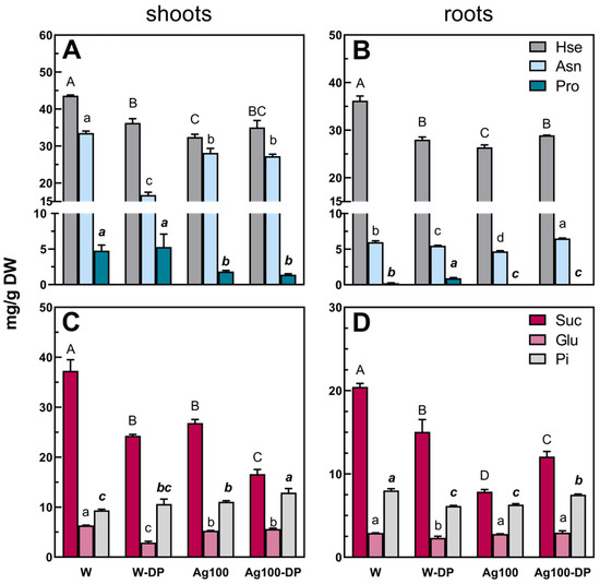 The concentrations of selected metabolites: homoserine (Hse), asparagine (Asn), proline (Pro), sucrose (Suc), glucose (Glu), and phosphoric acid (Pi) in the shoots (A,C) and roots (B,D) of pea (Pisum sativum L.) developed for 21 days (from water- or bio-AgNPs-primed seeds) without infection or for 14 days after inoculation of 7-day-old seedlings with D. pinodes. Values (in mg/g DW) are the means of 3 replicates + SD. The same letters (A–D; a–d; a–c; separately for each metabolite) above the bars indicate statistically insignificant (p ≤ 0.05) differences based on two-way ANOVA and Tukey’s post–hoc test. Abbreviations: W and W-DP—non-infected seedlings and seedlings infected with D. pinodes, respectively, grown from water-primed seeds; Ag100 and Ag100-DP—non-infected seedlings and seedlings infected with D. pinodes, respectively, grown from seeds primed with bio-AgNPs at a concentration of 100 mg/L.
