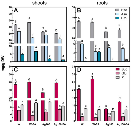 The concentrations of selected metabolites: homoserine (Hse), asparagine (Asn), proline (Pro), sucrose (Suc), glucose (Glu) and phosphoric acid (Pi) in the shoots (A,C) and roots (B,D) of pea (Pisum sativum L.) developed for 21 days (from water- or bio-AgNPs-primed seeds) without infection or for 14 days after inoculation of 7-day-old seedlings with F. avenaceum. Values (in mg/g DW) are the means of 3 replicates + SD. The same letters (A–D; a–d; a–c; separately for each metabolite) above the bars indicate statistically insignificant (p ≤ 0.05) differences based on two-way ANOVA and Tukey’s post–hoc test. Abbreviations: W and W-FA—non-infected seedlings and seedlings infected with F. avenaceum, respectively, grown from water-primed seeds; Ag100 and Ag100-FA—non-infected seedlings and seedlings infected with F. avenaceum, respectively, grown from seeds primed with bio-AgNPs at a concentration of 100 mg/L.