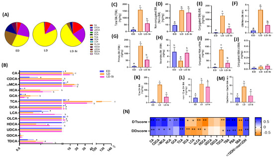 Cecal bile acids (BA) contents and profile in the early-stage diabetes (ED), late-stage diabetes (LD), and late-stage diabetes-silicon (LD-Si) groups. BA content was expressed in ng/mg. Values expressed as mean ± SD. Different letters (a < b < c) indicate significant differences between groups (ANOVA, Bonferroni post hoc test, p < 0.05). (A) BA percentages in each experimental group, (B) BA profile, (C) Total bile acids (TBA), (D) Non-conjugated BA (non-cBA), (E) Conjugated BA or Bile salts (cBA), (F) Conjugated/non-conjugated BA ratio (cBA/non-cBA), (G) Primary BA (PBA), (H) Secondary BA (SBA), (I) Conjugated PBA (cPBA), (J) conjugated SBA (cSBA), (K) 12 α-hydroxylated BA (12α-OHBA), (L) non-12 α-hydroxylated BA (non-12α-OHBA), (M) 12α-OHBA/non-12α-OHBA ratio, (N) Heatmap showing relation between BA profile and DTscore and DDscore. The color intensity of the heatmap represents the association degree: Blue, positive association; Orange, negative. * Denotes adjusted: * p < 0.01, ** p < 0.001. Pearson’s correlation coefficients values were used for the matrix.