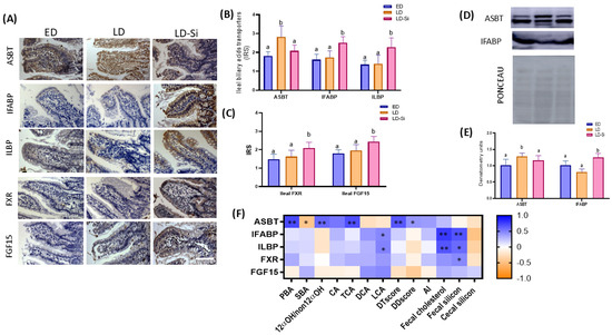 The immunolocalization and immunoreactivity scores (IRSs) of three transporters: the ileal apical sodium bile salt transporter (ASBT), intestinal fatty acid binding protein (I-FABP) and ileal lipid binding protein (ILBP), as well as the levels of ileal FXR and FGF15, are presented in Figure 2A–C (Kruskal–Wallis and Dunn’s tests, p < 0.05). ASBT and I-FABP levels were also assayed by Western blotting (Figure 2D,E) (ANOVA, Bonferroni post hoc test, p < 0.05). Figure 2F illustrates the correlations between ileal ASBT, I-FABP, ILBP, FXR and FGF15 levels and PBA, SBA, 12α-OHBA/non-12α-OHBA ratio, CA, TCA, DCA, LCA, DTscore, DDscore, AI, fecal cholesterol, fecal silicon and cecal silicon contents (Pearson’s or Spearman’s correlation coefficients (r), p < 0.05).