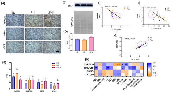 Hepatic CYP7A1, HMCGR, BSEP and NTCP levels in the early-stage diabetes (ED), late-stage diabetes (LD) and Si-RM consumption in late-stage diabetes (LD-Si) groups. (A) Representative images of immunohistochemistry labeling of cholesterol 7 alpha-hydroxylase1 (CYP7A1), 3-hydroxy-3-methylglutaryl CoA reductase (HMGCR), bile salt export pump (BSEP) and Na+-taurocholate co-transporting polypeptide (NTCP). Scale bar: 50 µm. (B) Immunoreactivity score (IRS) of CYP7A1, HMCGR, BSEP and NTCP. (C) BSEP and Ponceau (loading control) bands from Western blot. (D) Percentage data of densitometric quantification for BSEP. Values expressed as mean ± SD (n = 8). Different letters (a < b) indicate significant differences between groups, Kruskal–Wallis and Dunn’s tests (p < 0.05). Correlations showing linear regression line and Spearman’s coefficient and significance (p < 0.05) between (E) hepatic CYP7A1 and intestinal FGF15, (F) hepatic BSEP and CYP7A1, (G) hepatic BSEP and intestinal FGF15 levels. LD-Si group values are marked with a circle. (H) Heatmap showing correlations between CYP7A1, HMCGR, BSEP and NTCP proteins with PBA, SBA, 12α-OHBA/non-12α-OHBA ratio, CA, TCA, DCA, LCA, DTscore, DDscore, atherogenic index (AI), fecal cholesterol, fecal daily silicon and cecal mucosa silicon contents. The color intensity of the heatmap represents the degree of association: Blue, positive association; Orange, negative. * Denotes adjusted: * p < 0.01, ** p < 0.001. Spearman’s correlation coefficient values were used for the matrix.