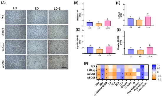 Hepatic FXR, LXRα/β, ABCG5 and ABCG8 in the early-stage diabetes (ED), late-stage diabetes (LD) and Si-RM consumption in late-stage diabetes (LD-Si) groups. (A) Representative images of immunohistochemistry labeling of hepatic farnesoid X receptor (FXR), liver X receptor transcription factor (LXRα/β), ATP-binding cassette subfamily G members 5 (ABCG5) and 8 (ABCG8). Scale bar: 50 µm. Immunoreactivity score (IRS) of hepatic (B) FXR, (C) LXRα/β, (D) ABCG5 and (E) ABCG8. Values expressed as mean ± SD. Different letters (a < b) indicate significant differences between groups, Kruskal–Wallis and Dunn’s tests (p < 0.05). (F) Heatmap showing correlations between hepatic FXR, LXRα/β, ABCG5, ABCG8 proteins with PBA, SBA, 12α-OHBA/non-12α-OHBA ratio, CA, TCA, DCA, LCA, DTscore, DDscore, atherogenic index (AI), fecal cholesterol and fecal silicon contents and cecal mucosa silicon content. The color intensity of the heatmap represents the degree of association: Blue, positive association; Orange, negative. * Denotes adjusted: * p < 0.01, ** p < 0.001. Spearman’s correlation coefficients values were used for the matrix.